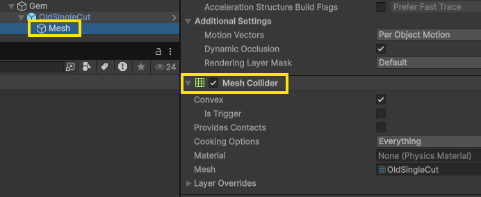 - OldSingleCut > Mesh의 Mesh Collider 삭제: 충돌 기능 사용하지 않음