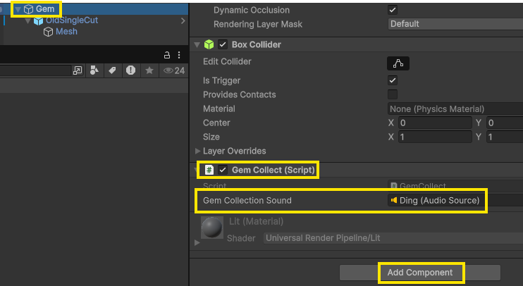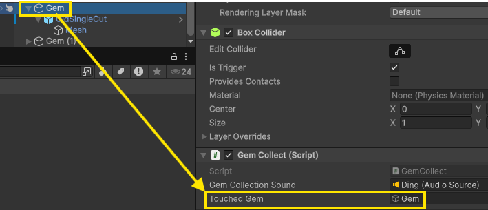 - 만든 Gem Collect 스크립트 컴포넌트 추가