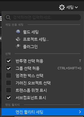 - 프로젝트의 제일 오른쪽 상단에 있는 설정메뉴에서 엔질 퀄리티 세팅 메뉴를 찾을 수 있음