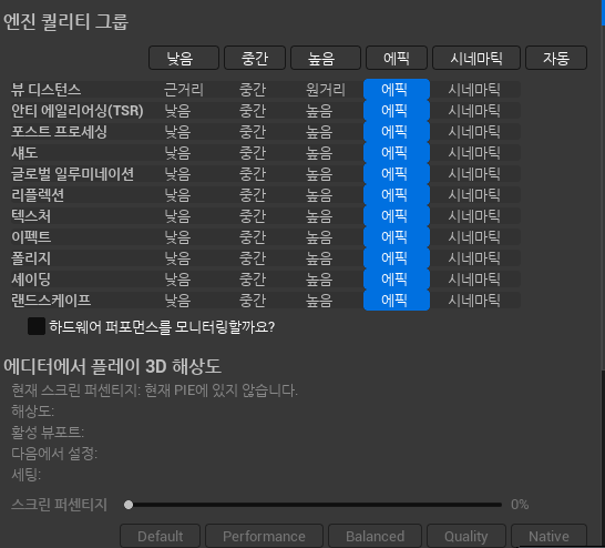 * 언리얼엔진이 느려진다 싶을 때 에픽에서 높음으로 한 단계 낮춰서 실행하기