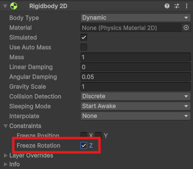 (1) Constraint: Rigidbody2D가 물리 연산 중 움직이거나 회전하면 안되는 축을 잠그는 기능