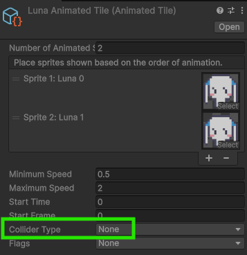 - Animated Tile로 만들면 Collider Type이 기본적으로 "None"으로 들어가기 때문에 충돌이 발생하지 않음