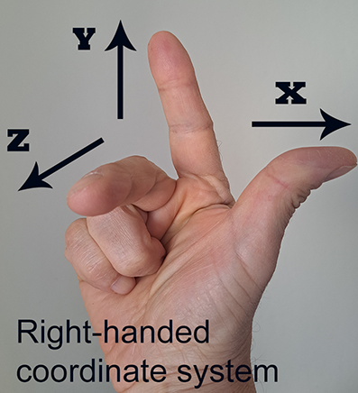 - 오른손의 엄지, 검지, 중지를 이용해 축의 방향 정의