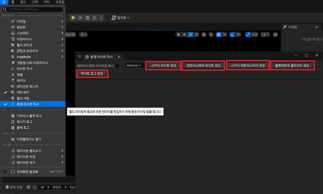 4-2-1) 메뉴 - 창 > 환경 라이트 믹서 클릭 > 원하는 환경 생성