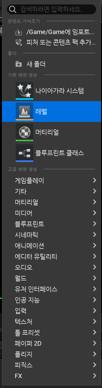 (1) 콘텐츠 브라우저에서 오른쪽 마우스 - 레벨을 통해 레벨의 기초 생성
