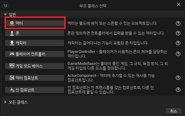 - 액터 블루프린트 클래스: 월드에 배치되는 액터에 대해 설정하는 클래스