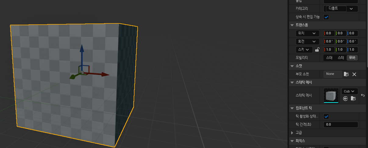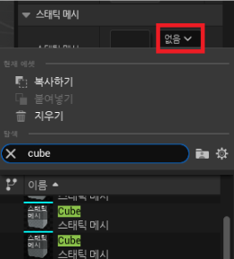 ex) 큐브모양으로 설정할 시: 스태틱 메시 메뉴에서 없음 선택 > cube 검색 > 원하는 큐브모양 선택
