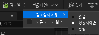 - 컴파일 버튼 > 컴파일시 저장 > 성공시에만 으로 체크하면 컴파일 성공했을 때 파일을 자동으로 저장해줌