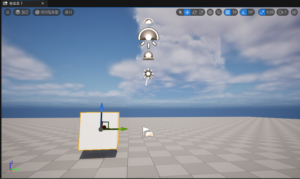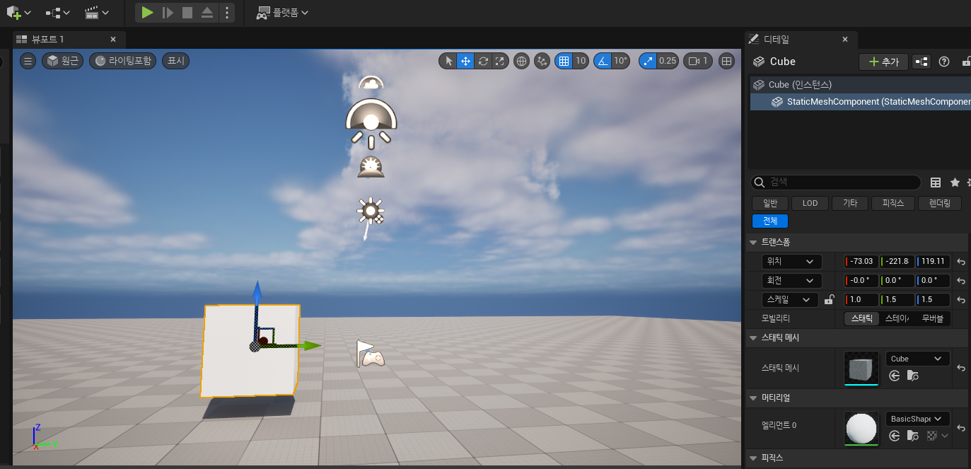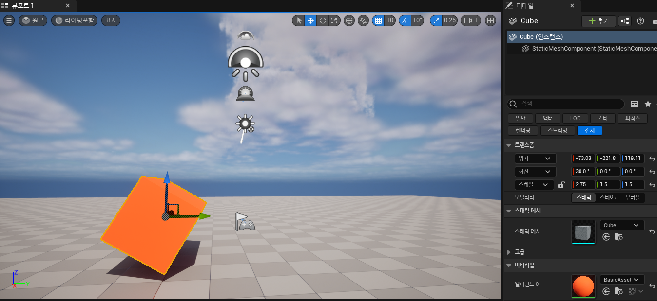 * 액터의 위치 / 회전 / 스케일 변경을 위한 단축키 : 액터 선택 후 w(위치 이동) / e(회전) / r(스케일 변경)