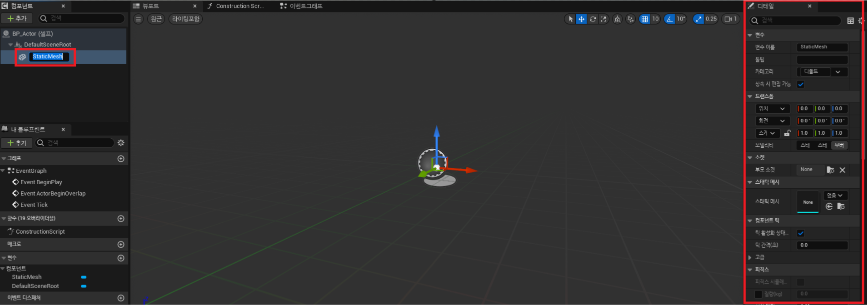 - 디테일 창에 스태틱 메시 컴포넌트에 대한 속성이 생성됨