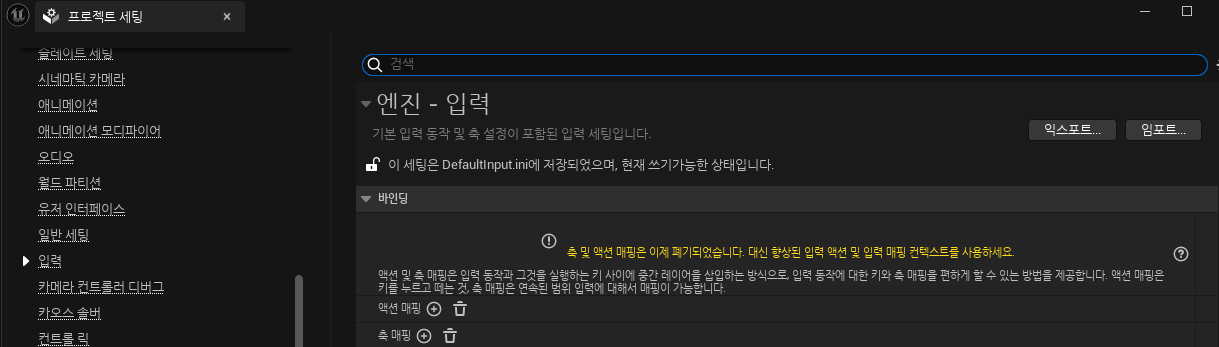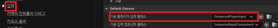 - 프로젝트 설정 > 입력 에서 Default Classesd의 기본 플레이어 입력 클래스를 'EnhancedPlayerInput' 으로 설정