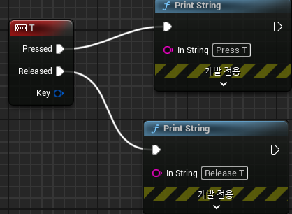 - Print String은 Stack 형식으로 데이터가 생김: T키를 먼저 눌렀기 때문에 Press T가 Release T 보다 아래에 찍힘