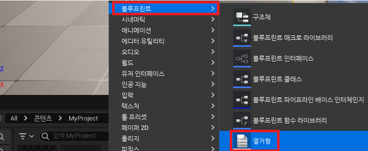 1) 열거형 생성하기: 오른쪽 마우스 클릭 > 블루프린트 > 열거형 선택
